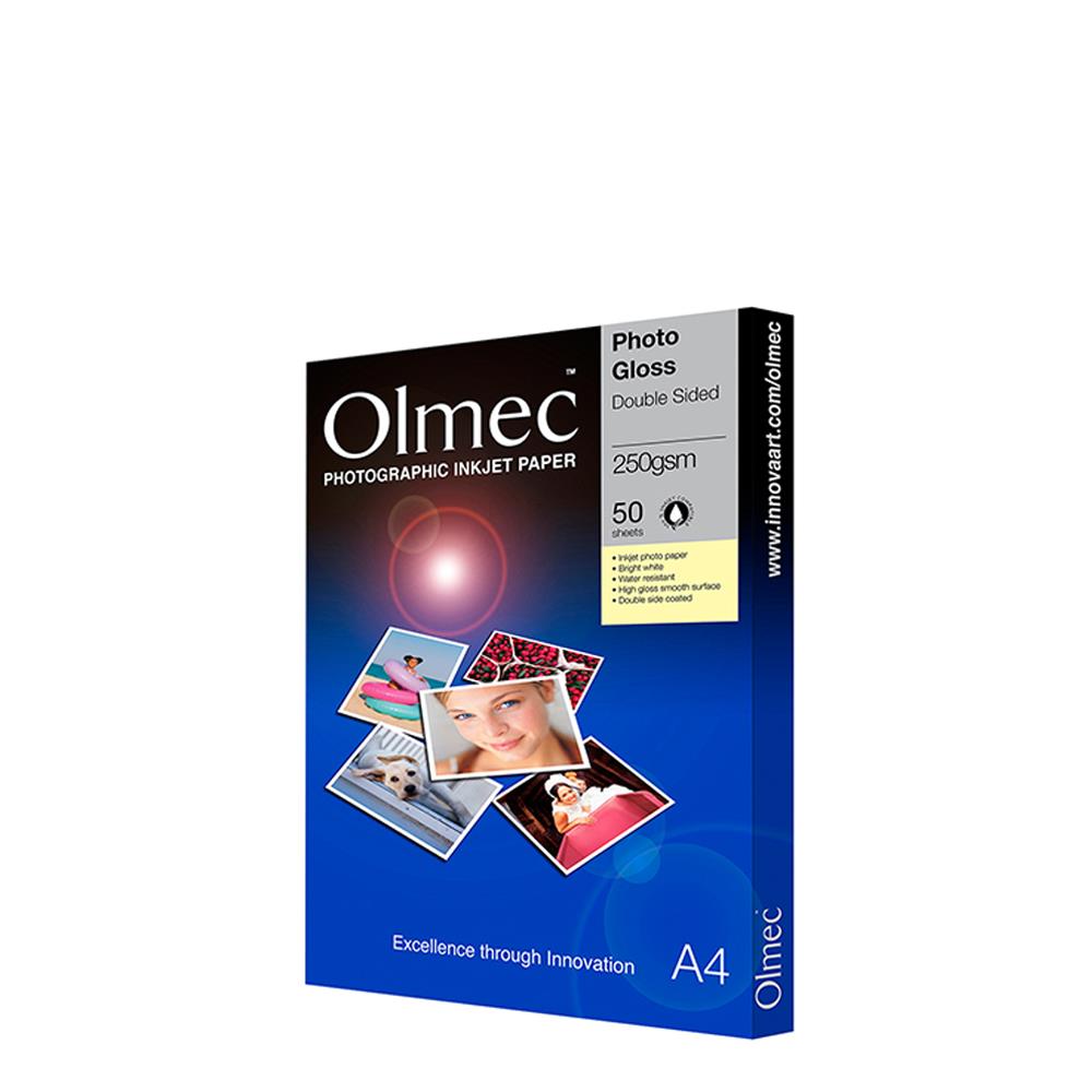 Olmec Photo Glossy 250gsm Double Sided (OLM65) A fade resistant microporous mid-weight double side coated RC base paper which gives a true photographic look and feel. This is a high gloss, high white paper with a smooth finish which has been developed specifically for generating photographic quality prints or enlargements of your favourite images.